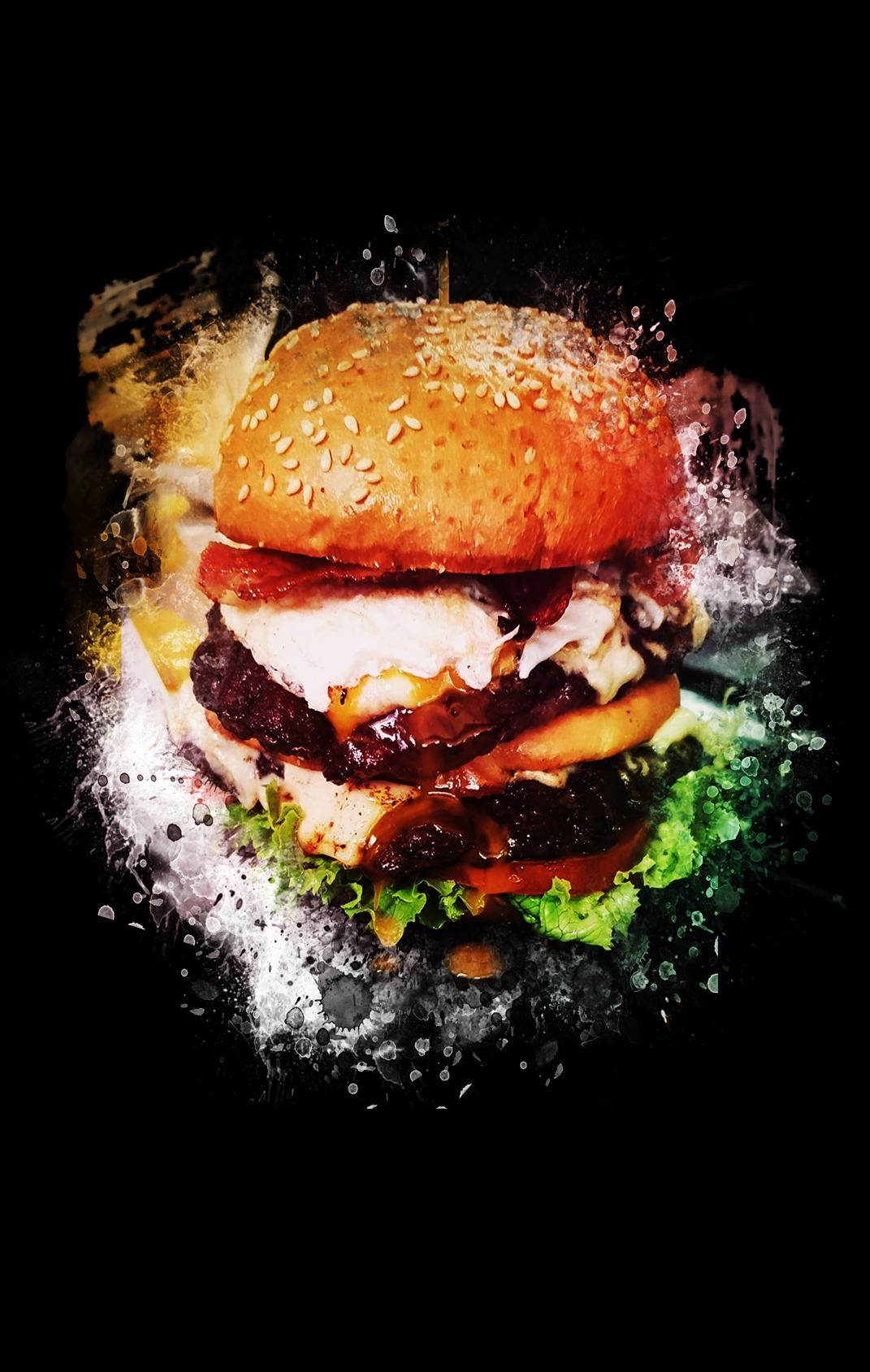 100% junetina 300g, domaći BBQ umak, karamelizirani luk, zelena salata, rajčica, 2x sir, jaje, panceta + pomfrit.