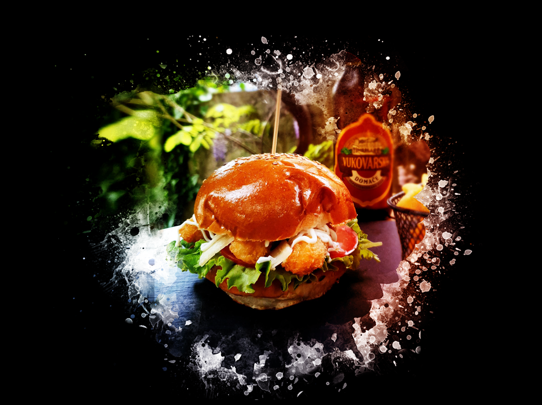 100% junetina 150g, kečap + majoneza umak, karamelizirani luk, zelena salata, rajčica, mix sir, kiseli krastavci + pomfrit.