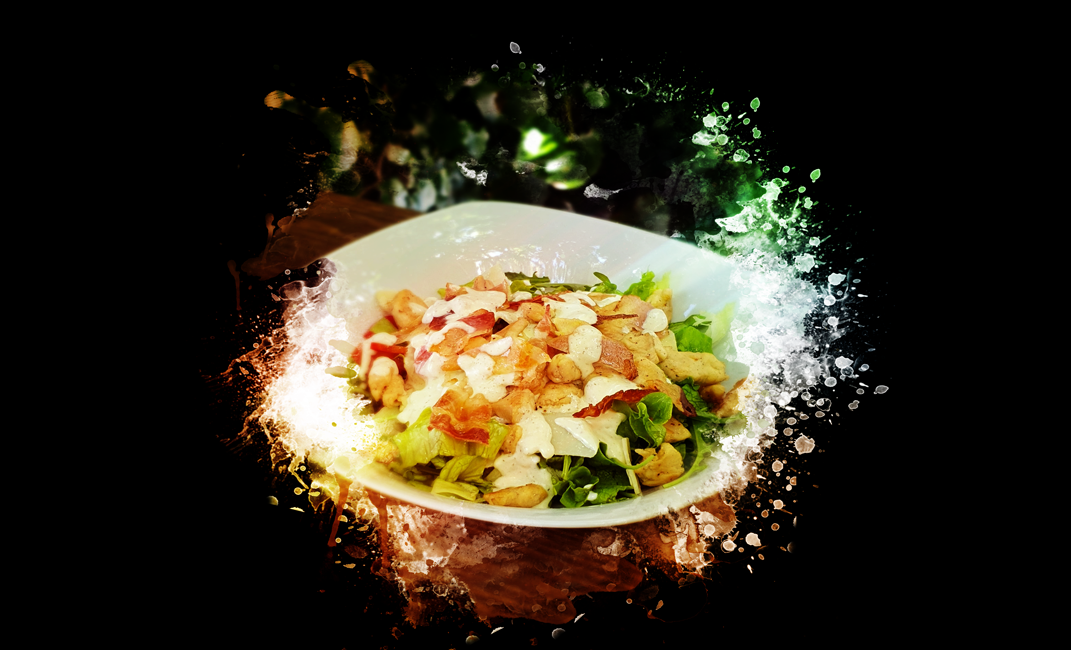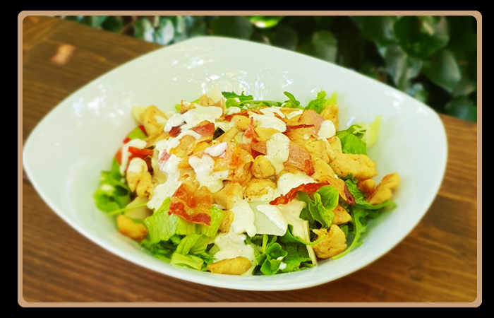 Piletina, zelena salata, rajčica, panceta, grana padano, krutoni, domaći cezar umak.