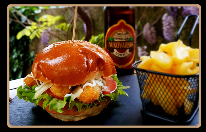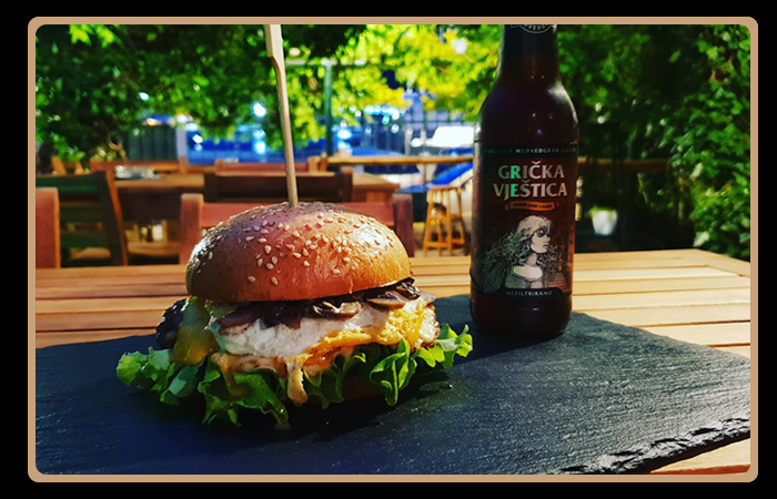 100% junetina 150g, ajvar, karamelizirani luk, zelena salata, kulen, sir, gljive + pomfrit.