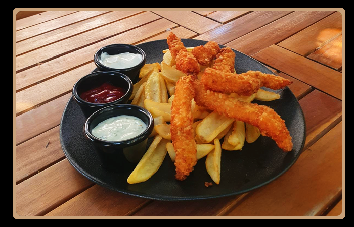 Pržene pileće trakice sa sezamom, tartar umak + pomfrit.