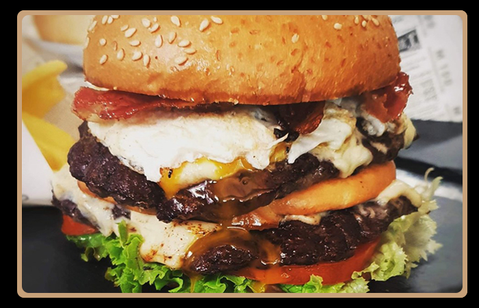 100% junetina 150g, domaći BBQ umak, karamelizirani luk, zelena salata, rajčica, sir, jaje, panceta + pomfrit.